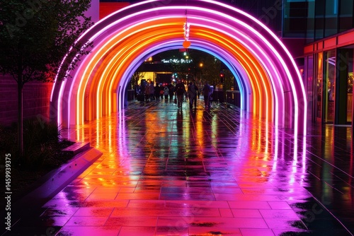 modern, path, exploration, glow, neon, installation, colourful, lively, shine, design, photo, spectrum, crowd, event, dynamic, city, creative, social, archway, outdoors, gathering, rainbow, pedestrian, urban, surface, interaction, street, light, public, nightlife, structure, reflections, atmosphere, electric, innovation, vibrant, illuminated, wet, scene, paseo, architecture, enchanting, night, glowing, art, artistic, bright, rain