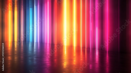 Vibrant Neon Light Columns in Dark Room – Futuristic Glowing Abstract Background with Colorful Vertical Light Beams Reflection