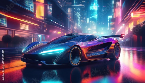 Vibrant Neon Lights Illuminating a Shiny Futuristic Sports Car on a Blurred Cyberpunk City Street Backdrop, at