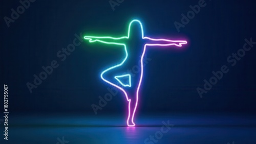 yoga, pose, neon, glow, balance, fitness, meditation, silhouette, abstract, wellness, exercise, health, spiritual, harmony, peaceful, energy, vibrant, colourful, studio, dark, background, digital, art, modern, light, active, training, stretch, flexibility, practice, calm, mindfulness, body, shape, line, design, graphic, futuristic, glowing, outline, tranquil, serene, inner, strength, fluidity