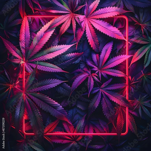 Vibrant neon-lit cannabis leaves arranged in artistic composition with glowing pink frame, creating a striking contrast and modern aesthetic.