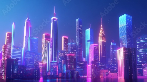 city, skyline, night, neon, light, building, skyscraper, urban, architecture, metropolis, modern, futuristic, glow, illumination, vibrant, colourful, bright, energy, dynamic, abstract, graphic, illustration, design, background, scene, view, panorama, water, dark, blue, pink, purple, light, style, art, image, digital, technology, fantasy, future, progress, development, power, majestic, magnificent