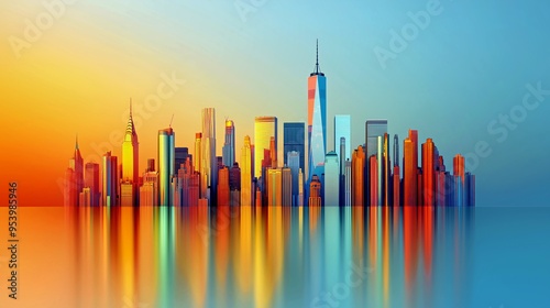 new york city, city, skyline, sunset, colourful, reflections, vibrant, urban, architecture, modern, skyscraper, city landscape, iconic, us, building, horizon, evening, orange, blue, artistic, abstract, design, tower block, light, urban scene, metropolis, beautiful, aesthetic, dynamic, travel, landscape, building, skyscraper, tower, night, view, light, downtown, illustration, business, sky