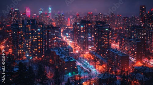 city landscape, urban, neon light, skyscraper, night time, skyline, twilight, evening, downtown, building, architecture, metropolis, street light, city landscape, city lights, night photography, illuminated, city street, winter, snow, cold weather, futuristic, vibrant, colourful, night view, city centre, tall building, residential area, travel, street scene, mysterious, dramatic, dark sky