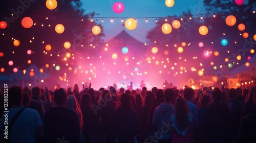 Vibrant night festival with colorful lanterns and crowd enjoying music outdoors