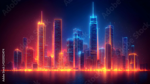 city landscape, night, neon, light, skyline, urban, modern, building, architecture, futuristic, glow, vibrant, colourful, red, blue, orange, water, dark, bright, energy, dynamic, technology, future, metropolis, scene, illustration, graphic, design, abstract, art, digital, artwork, image