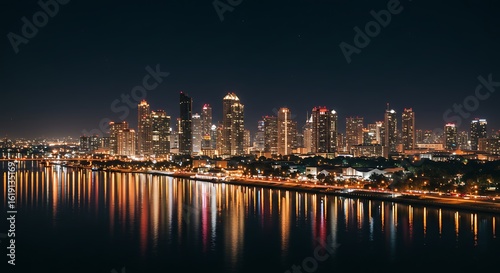 Vibrant nocturnal cityscape featuring a glowing metropolitan skyline with colorful light reflections on the waterfront.