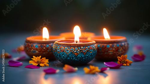 Vibrant oil lamps with flickering flames create a festive atmosphere, ideal for Diwali or other celebrations. Perfect for invitations, greetings, and festive decor.