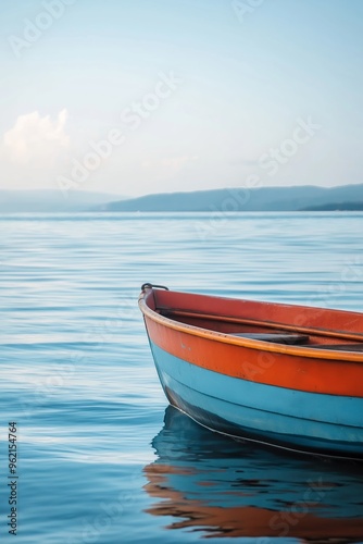 Vibrant orange and blue boat floats serenely on calm water with distant mountains, a perfect scene of tranquility.