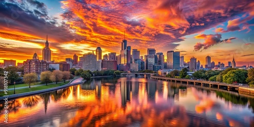 Vibrant orange and pink hues illuminate the city skyline as sunset casts a warm glow over the serene river, majestic buildings, and dramatic clouds.