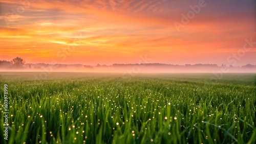 Vibrant orange and pink sunrise illuminates a misty green field with dew drops on grass blades