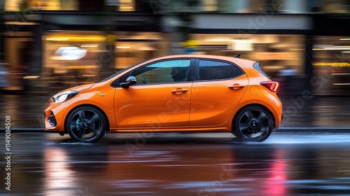 Vibrant Orange Compact Car Driving Through Rainy City Streets