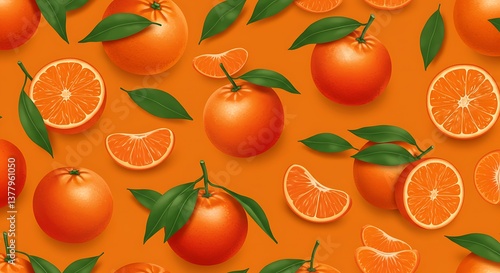 orange, citrous, fruit, segment, slice, leaf, pattern, background, wallpaper, design, vibrant, juicy, healthy, food, texture, illustration, ripe, fresh, sweet, colours