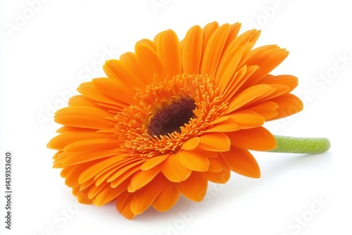 Vibrant orange gerbera daisy flower resting on a white background, showcasing its beauty