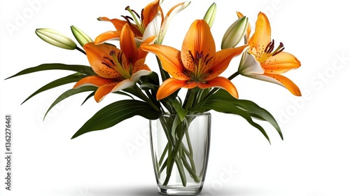 lily, flower, orange, bouquet, vase, glasses, floral, bloom, blossom, flower petals, plant, beautiful, bright, colours, nature, still life, photo, studio, image, background, white, elegant, decoration, fresh, spring, summer, vibrant, closeup, arrangement, botanical, flora, delightful, lovely, high-coloured, beauty, charming, spectacular, magnificent, gorgeous, artistic