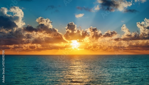 vibrant orange sunset reflects in teal ocean with textured clouds and golden sunlight