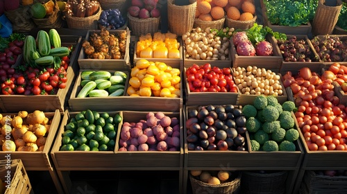 Vibrant Organic Vegetable Market Stalls with Fresh 3D Illustrated Produce