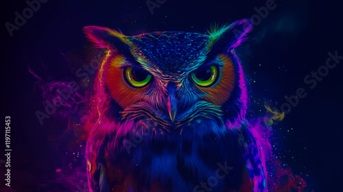 vibrant, owl, illuminated, colourful, light, dark, background, glowing, bird, feather, neon, bright, art, wildlife, nature, mystical, night, forest, eye, design, silhouette, fantasy, magic, fantasy art, abstract, aethereal, radiant, mysterious, enchanting, electric, artistic