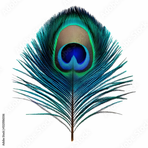 Vibrant Peacock Feather Detailed Close-up Image on White Background, Showing the Intricate Structure and Iridescent Colors of the Feather.