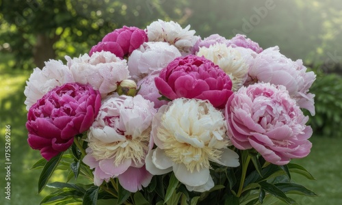 Vibrant peony bouquet with water droplets in a lush green garden setting