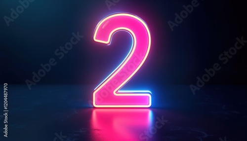 Vibrant pink, blue neon number two glows on dark background. 3D rendering shows glossy finish, futuristic style. Illuminated design for tech gaming projects. Modern art, design elements. Use for