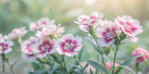 Vibrant pink Dianthus Chinensis flowers bloom in the garden, delicate petals unfolding like tender kisses, against a soft natural background with ample copyspace.