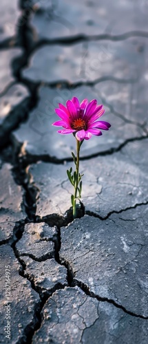 Vibrant pink flower amidst cracked earth, soft light,macro detail, symbolism of resilience in gray desolation, nature's perseverance blooming.