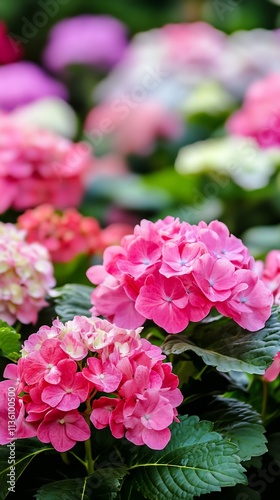 Vibrant Pink Hydrangea Blossoms with Lush Green Leaves in a Colorful Garden Setting : Generative AI