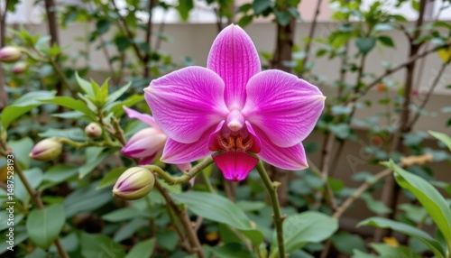 Vibrant Pink Orchid Flower Blooming Amidst Lush Green Foliage in a Garden Setting