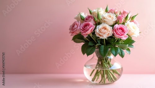 Vibrant pink, white roses fill clear glass vase, resting on pink table against soft pink backdrop. Delicate petals, green leaves create romantic, fresh floral arrangement. Beautiful bouquet joy,