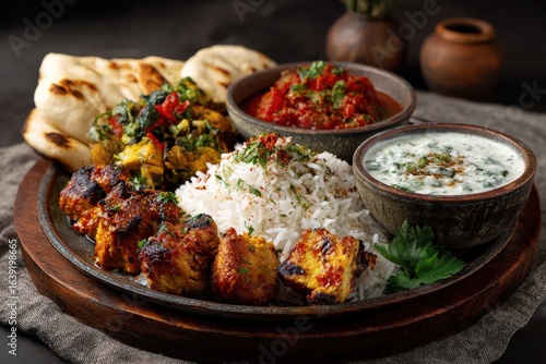 Vibrant plate of authentic Indian cuisine featuring grilled kebabs, aromatic rice, and flavorful curries displayed in a cozy dining setting