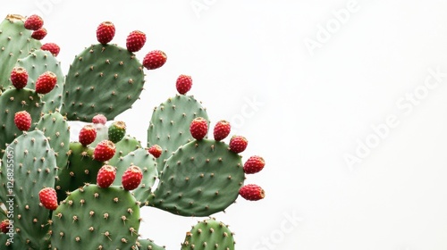Vibrant Prickly Pear Cactus with Bright Red Fruits against White Background