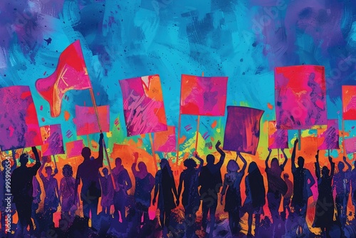 protest, crowd, flag, banner, artistic, demonstration, vibrant, colourful, dynamic, silhouette, oneness, activism, social, movement, freedom, expression, paint, abstract, urban, people, community, revolution, bold, bright, energy, gathering, solidarity, signs, public, street, art, illustration, creativity, spirited, lively, political, march, rally, racked, cause, purpose, resistance, civic, powerful, collective