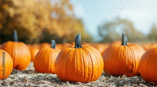 Vibrant Pumpkins in a Sunlit Pumpkin Patch During Autumn Season