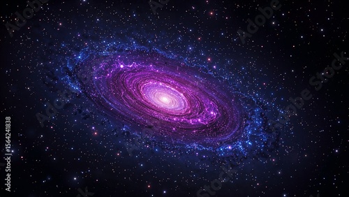 Vibrant purple and blue spiral arms define a galaxy amidst a field of sparkling stars. Evokes cosmic wonder and vastness, ideal for astronomy or science fiction.