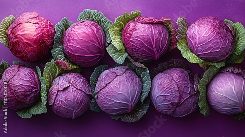 Vibrant purple cabbages arranged symmetrically on a bold purple backdrop, clean and colorful top view