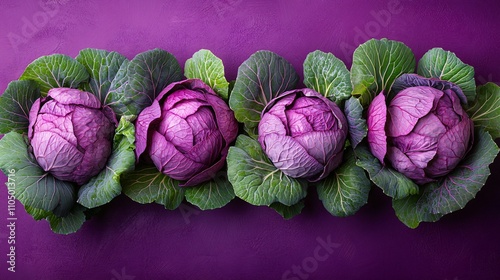 Vibrant purple cabbages arranged symmetrically on a bold purple backdrop, clean and colorful top view