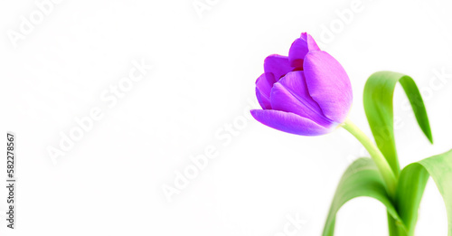 Vibrant purple tulip close-up isolated on white background with copy space, banner
