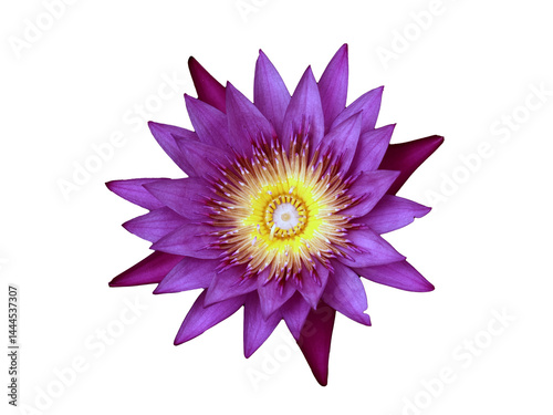 Vibrant purple water lily with striking yellow center, showcasing its delicate petals and natural beauty