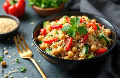 Vibrant quinoa salad with chickpeas, colorful vegetables like cucumber, red bell pepper, fresh parsley garnish. Healthy low-carb meal, perfect for vegetarian, vegan, gluten-free diets. Wholesome dish