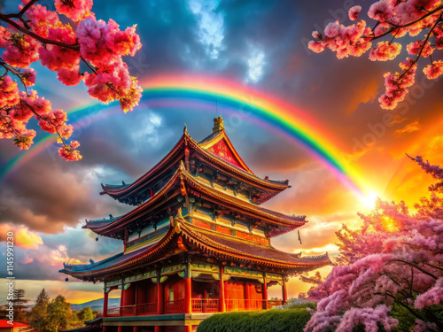 vibrant rainbow arcs over traditional pagoda surrounded by cherry blossoms, illuminated by stunning sunset. scene captures beauty of nature and architecture harmoniously