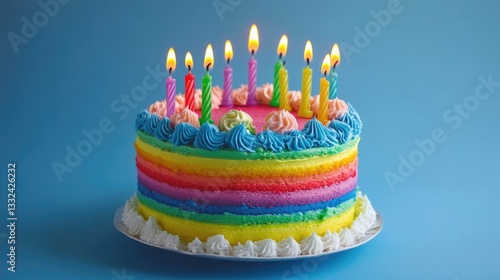 Vibrant rainbow cake with rainbow candles on blue background for party.
