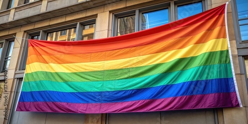 rainbow, flag, building, diversity, vibrant, pride, equality, colourful, celebration, symbol, freedom, identity, love, community, oneness, inclusion, parade, stripes, urban, architecture, window, wall, exterior, sunlight, hanging, display, large, public, street, city, background, fabric, horizontal, pattern, bright, cultural, equal, empowerment, visibility, right, expression, support, respect, solidarity, acceptance, banner
