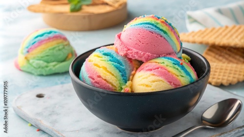 Vibrant Rainbow Ice Cream in a Black Bowl - A Colorful Scoop of Flavors and Textures