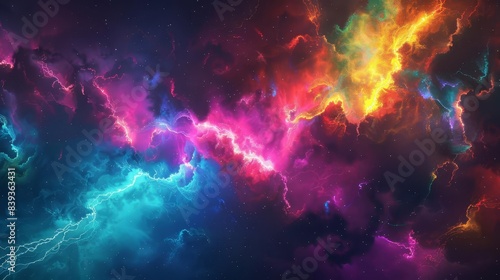 vibrant rainbow nebula with dramatic lightning in deep space abstract cosmic background digital art