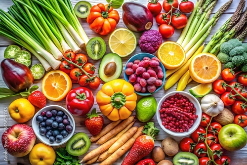 Vibrant rainbow of fresh fruits and vegetables arranged on wooden surface