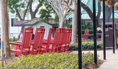 Vibrant red Adirondack rocking chairs lined up in a serene outdoor public plaza, inviting relaxation under sunny skies in a charming resort town square or park.