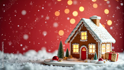 Vibrant red background with a gingerbread house and candy canes, space for text on the right side, falling snow, ornaments, gift boxes