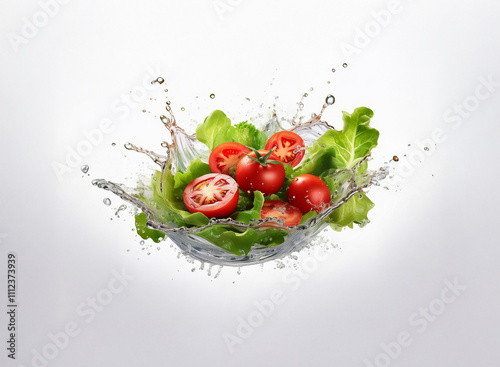 Vibrant red cherry tomatoes and fresh green lettuce leaves suspended in a dynamic water splash against a clean white background. A refreshing image showcasing healthy ingredients.
