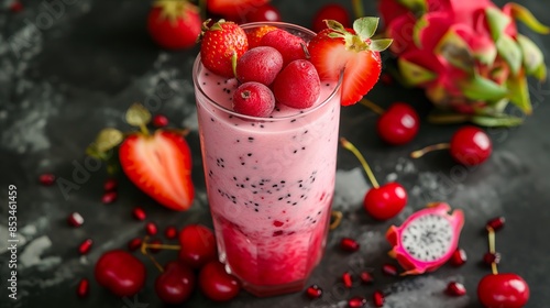 vibrant, red, dragon fruit, strawberry, smoothie, fresh, cherry, tropical, creamy, texture, bright, pink, refreshing, healthy, drink, beverage, fruit, blend, alimentary, colourful, delicious, summer, dessert, snack, breakfast, vegan, protein, antioxidant, vitamin, fiber, almond milk, mango, banana, exotic, tropical fruit, sweet, lemony, garnish